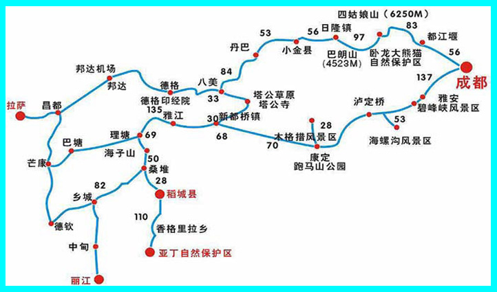 成都、雅安、二郎山隧道、折多山、新都橋、高爾寺山、雅江、剪子灣山、卡子拉山、理塘、毛埡大草原、兔子山、海子山自然保護區、稻城、赤土河谷 、日瓦、亞丁、珍珠海、沖古寺、仙乃日神山、央邁勇神山、奔子欄、金沙江、飛來寺、梅里雪山、瀾滄江、明永冰川、中甸、麗江、瀘沽湖。
