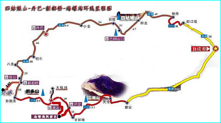 成都、都江堰、映秀、臥龍、日隆、雙橋溝、長坪溝、達(dá)維、丹巴、八美、新都橋、高爾士山、剪子灣山、雅江、卡子拉山、兔兒山、海子山自然保護(hù)區(qū)、稻城、亞丁自然保護(hù)區(qū)、波瓦山、日瓦、新都橋、九龍五須海、康定、折多山、貢嘎山、海螺溝、磨西鎮(zhèn)、瀘定。