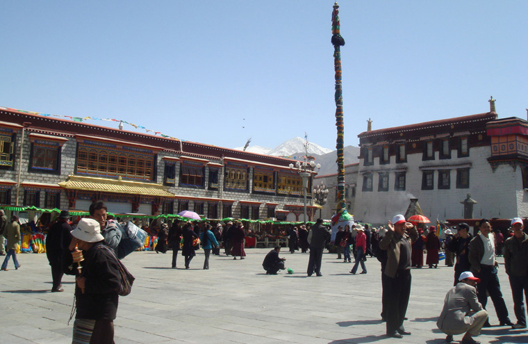大昭寺不僅僅是一座供奉眾多佛像、圣物以使信徒們膜拜的殿堂,它還是佛教中關(guān)于宇宙的理想模式-壇城(曼陀羅)這一密宗義理立體而真實的再現(xiàn)。在大昭寺的正門入口處前面,有三根石柱。一根石柱上用漢藏兩種文字刻著公元823年簽訂的唐蕃會盟書。